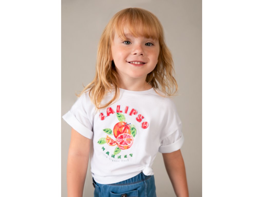 Roztomilé dívčí tričko Mayoral v bílé barvě zaujme veselým letním potiskem s motivem citrusů a nápisem Calipso Market. Barevný design dodává tričku svěží a hravý vzhled, který si malé slečny zamilují.