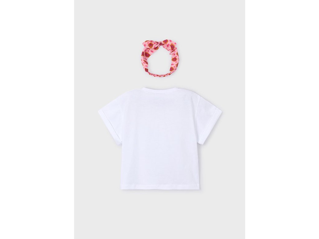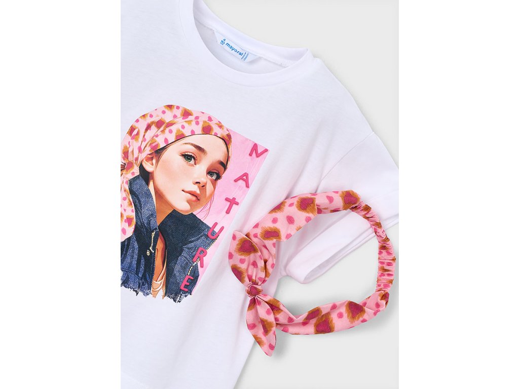 Roztomilý dívčí set Mayoral obsahující bílé tričko s moderním potiskem a sladěnou čelenku. Set je vyroben ze 100% bavlny, která je jemná, prodyšná a velmi příjemná na nošení. Ideální outfit pro každodenní nošení i stylové letní kombinace. Pohodlí a hravý design v jednom.