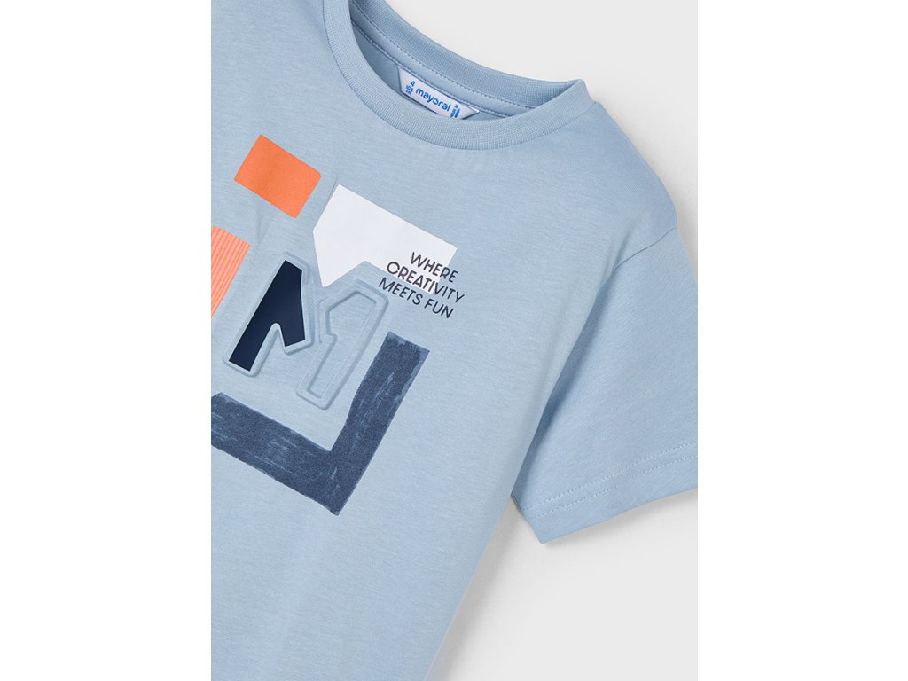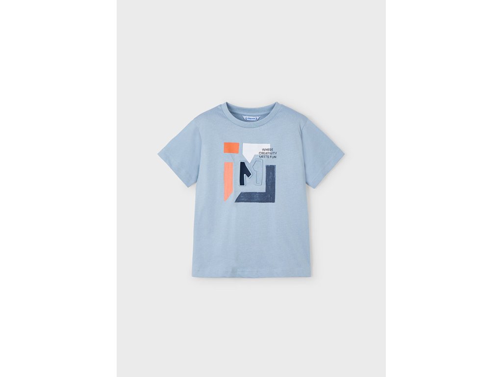Stylové chlapecké tričko Mayoral v jemně modré barvě je ideální volbou pro každodenní nošení. Vyrobené z 100% kvalitní bavlny, zaručuje maximální pohodlí, prodyšnost a příjemný pocit na pokožce. Přední stranu zdobí originální moderní potisk s nápisem "Where creativity meets fun", který dodává tričku hravý a módní vzhled.
