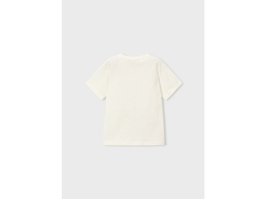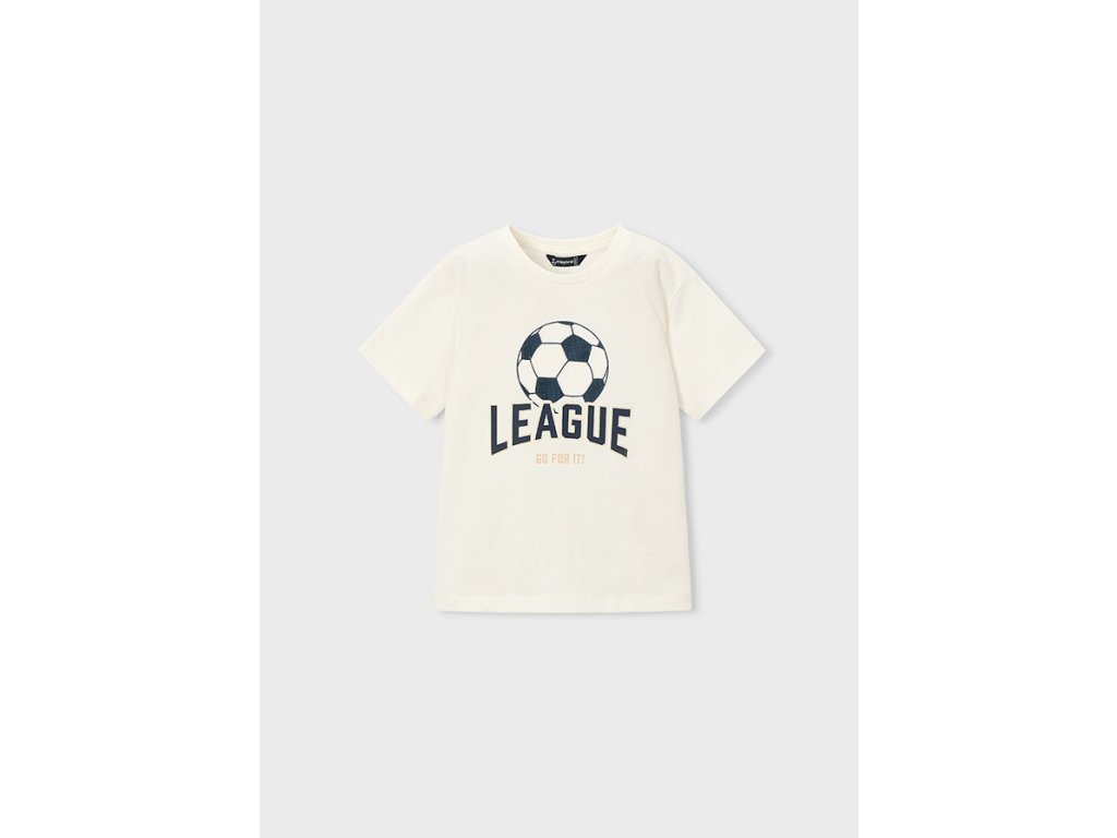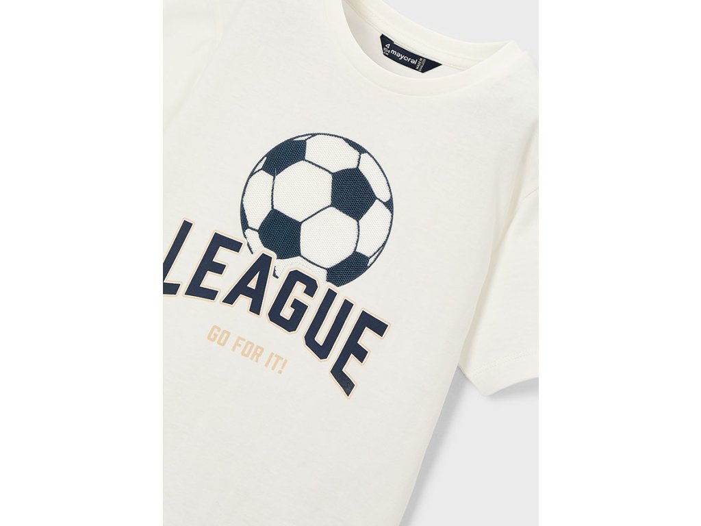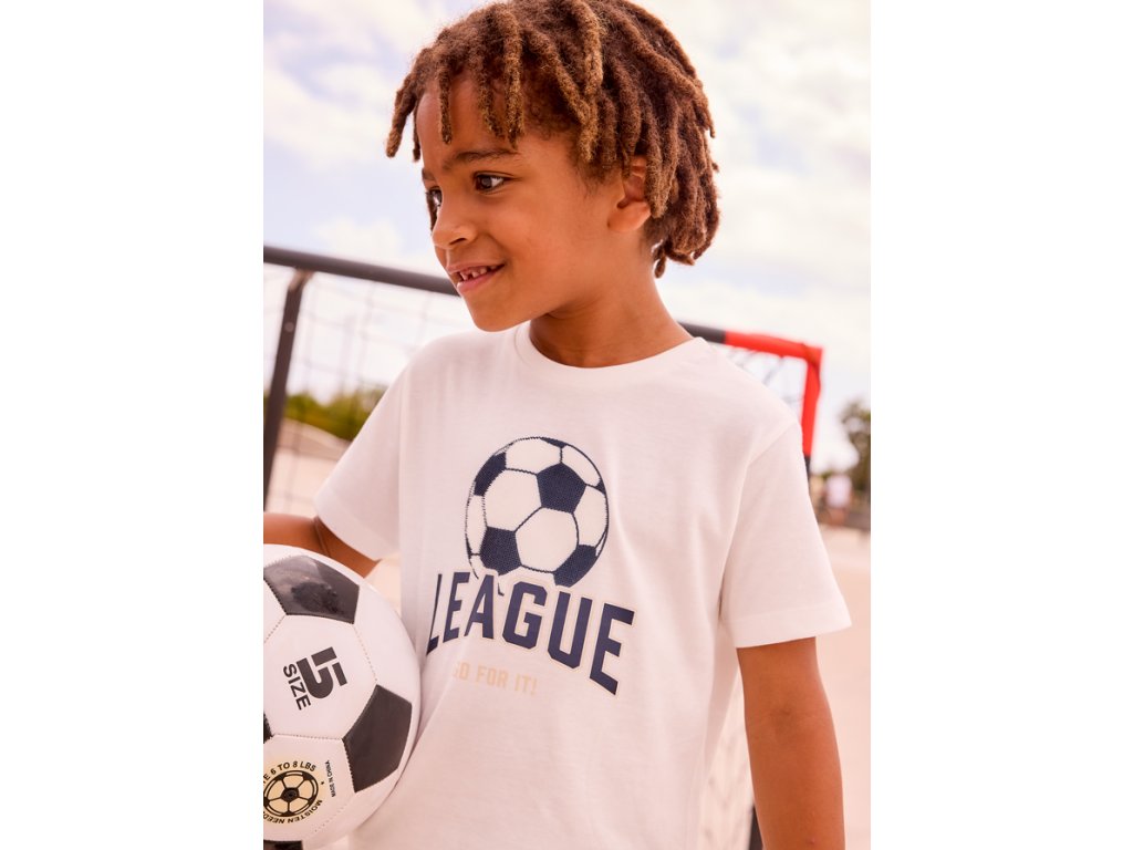 Stylové chlapecké tričko Mayoral s fotbalovým motivem je ideální volbou pro všechny malé sportovce. Bílé tričko zdobí výrazný potisk fotbalového míče a nápis „LEAGUE – Go for it!“, který dodává outfitu sportovní energii a moderní vzhled.