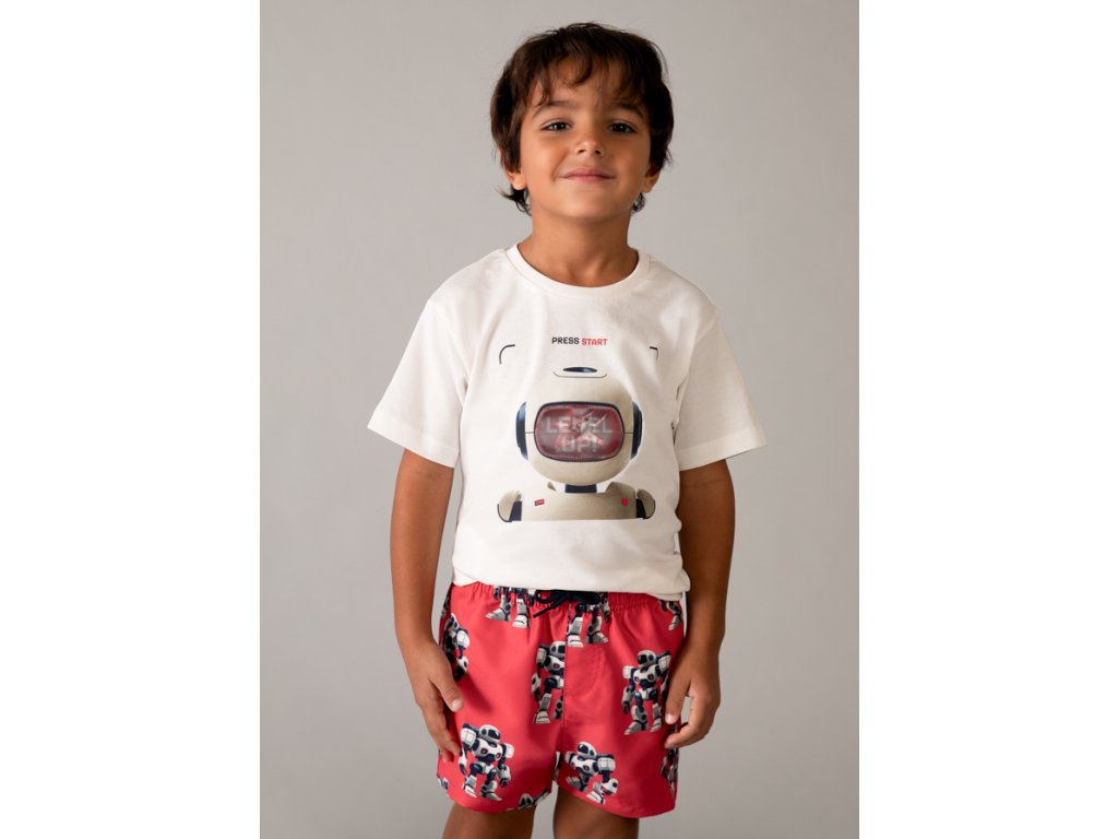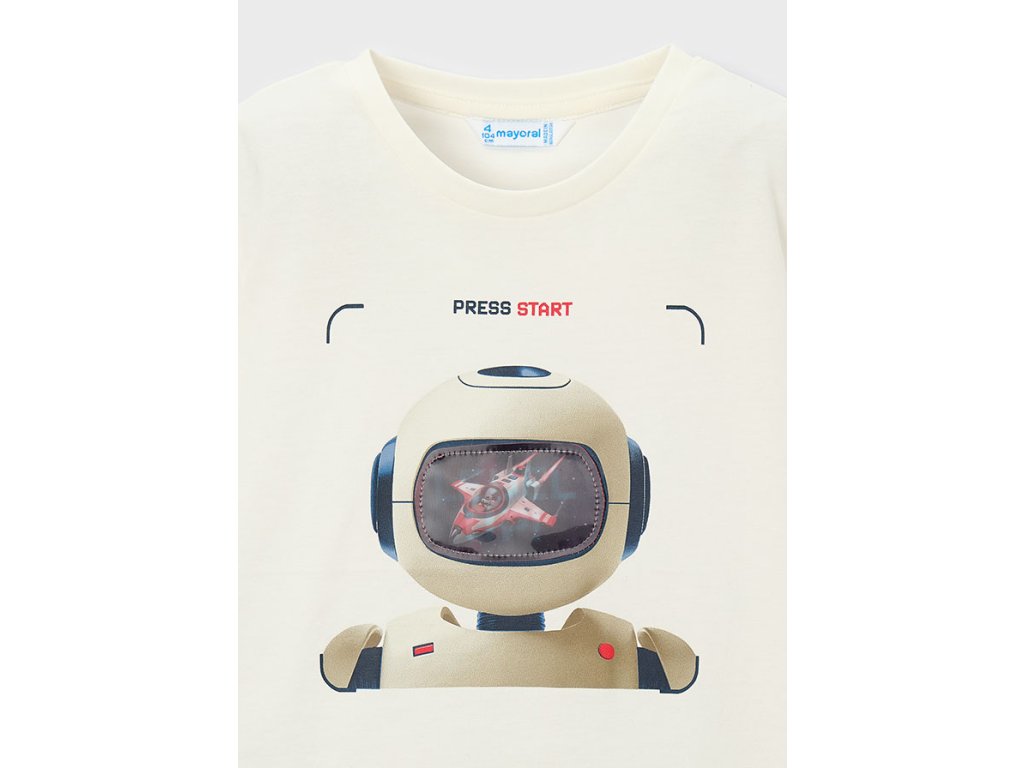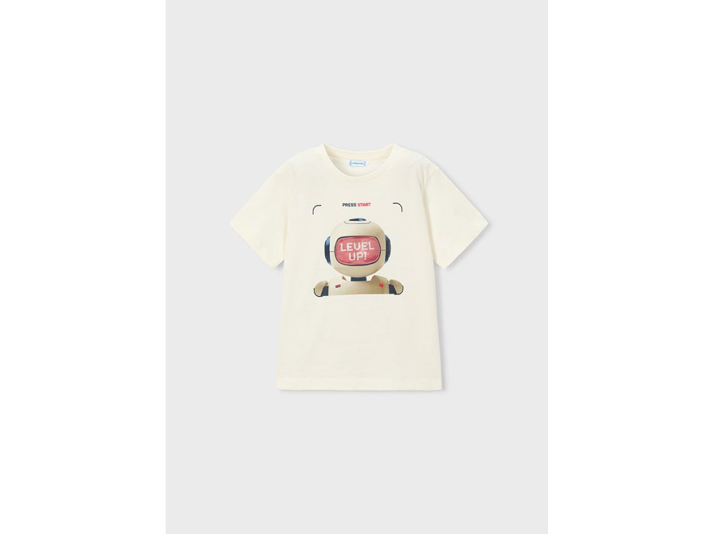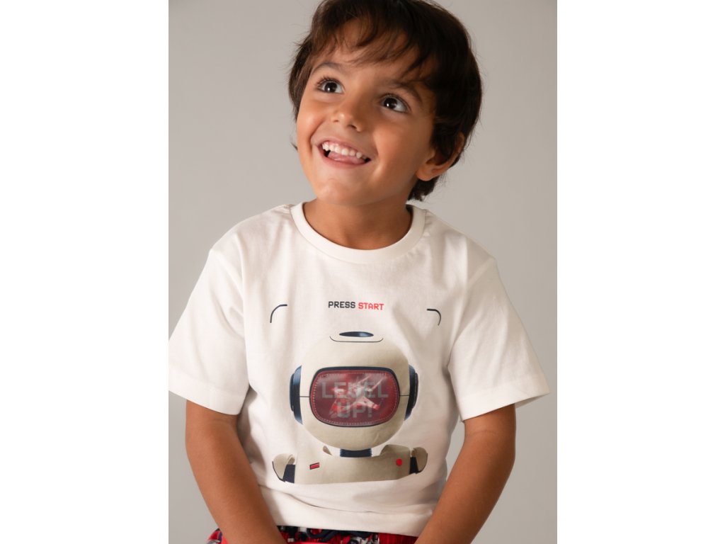 Moderní chlapecké tričko Mayoral s originálním potiskem robota nadchne všechny malé fanoušky techniky a her. Motiv s nápisem „Press Start – Level Up“ dodává tričku hravý a zábavný vzhled, který si děti okamžitě oblíbí.