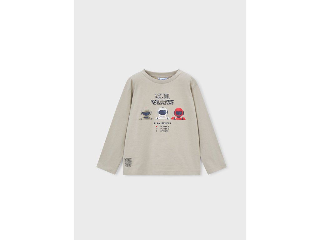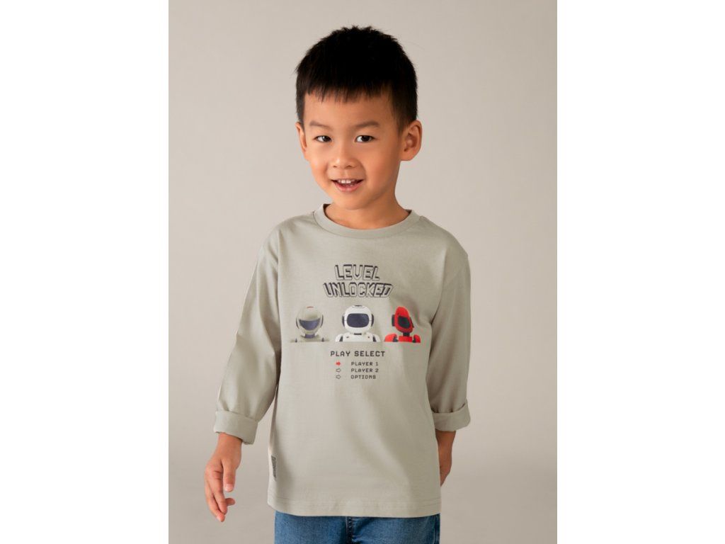 Stylové chlapecké tričko s dlouhým rukávem značky Mayoral zaujme na první pohled moderním potiskem „LEVEL UNLOCKED“ s motivem robotů, který potěší všechny malé milovníky her a dobrodružství 🤖🎮