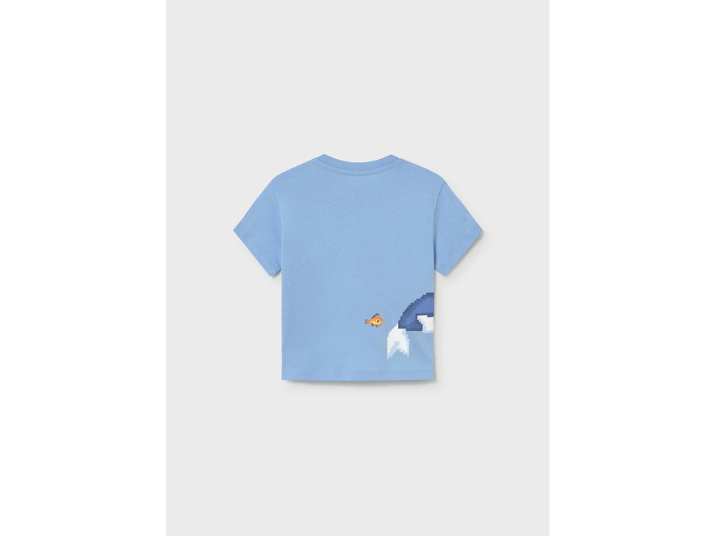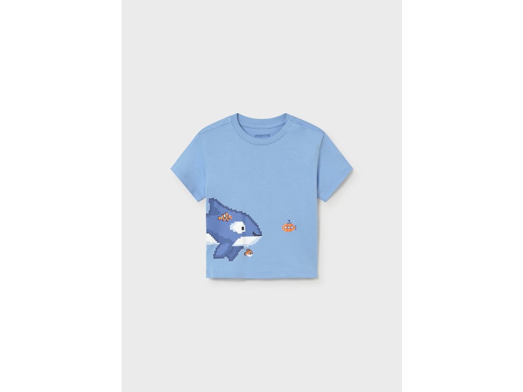 Roztomilé chlapecké tričko Mayoral v jemně modré barvě s hravým pixelovým motivem kosatky, klaunů a malé ponorky si zamilují všichni malí milovníci moře. Originální potisk působí zábavně a moderně – ideální na léto i do školky.