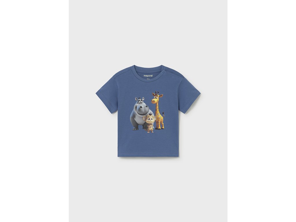 Roztomilé chlapecké tričko Mayoral v modré barvě s veselým potiskem zvířátek si děti zamilují na první pohled 🐵🦒🦛