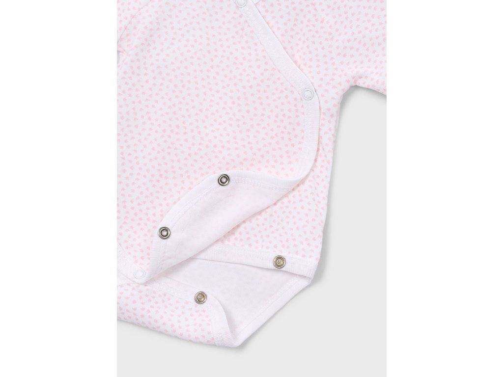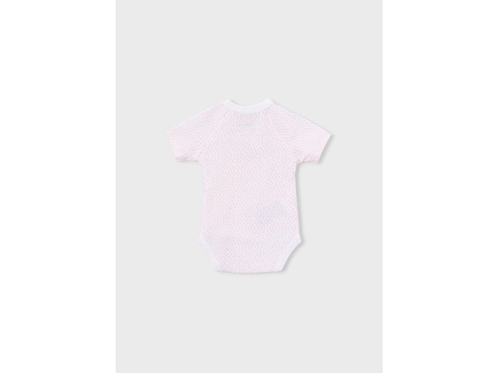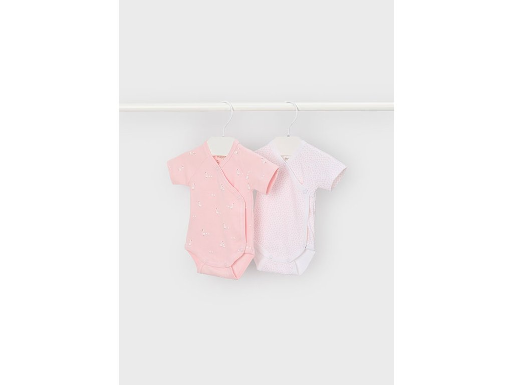 Praktický a něžný kojenecký set Mayoral Newborn obsahuje dvě body s krátkým rukávem v jemných růžovo-bílých tónech. Jedno body je zdobené drobným celoplošným motivem, druhé má jemný puntíkatý vzor – ideální kombinace na každodenní nošení.