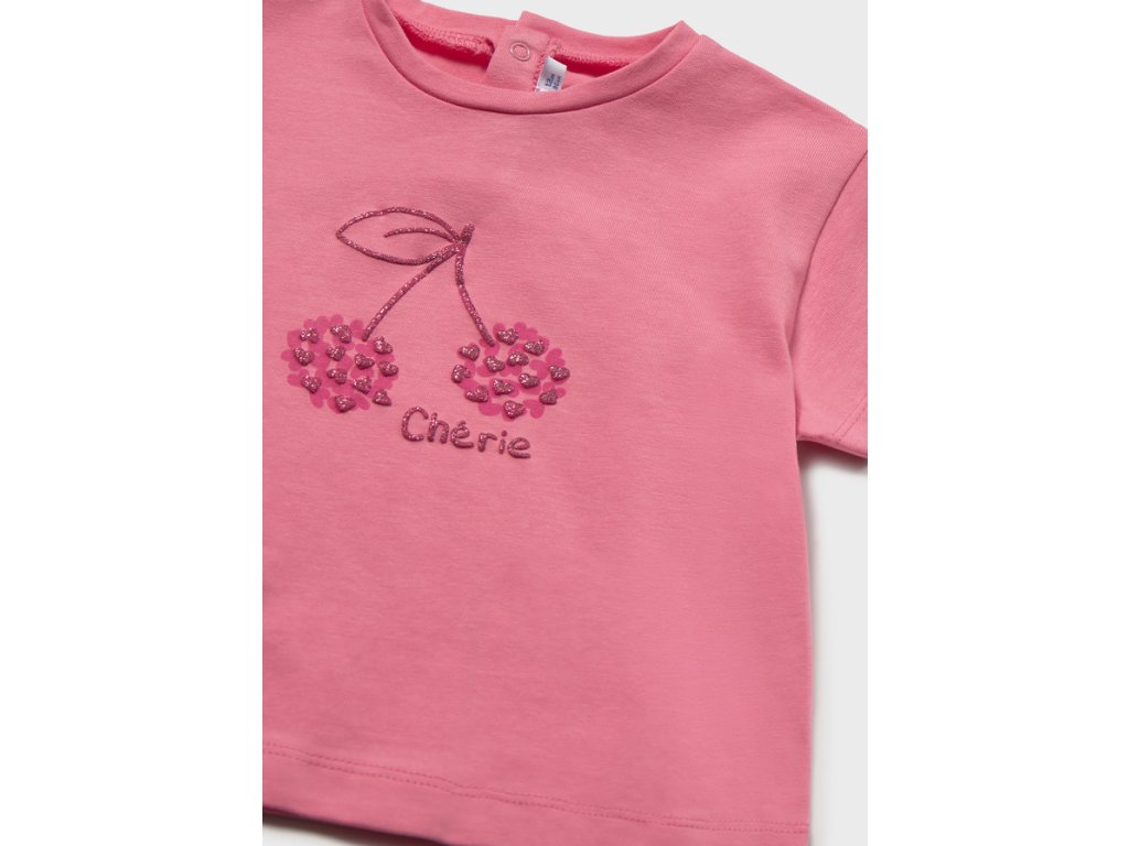 Roztomilé dívčí tričko Mayoral v jemně růžovém odstínu okouzlí na první pohled třpytivým motivem třešní a nápisem Cherie. Tričko je ušité z příjemného, měkkého materiálu, který je pohodlný na nošení po celý den. Díky příměsi elastanu se krásně přizpůsobí postavě a neomezuje v pohybu. Praktické zapínání na druk na zadní straně usnadňuje oblékání.
