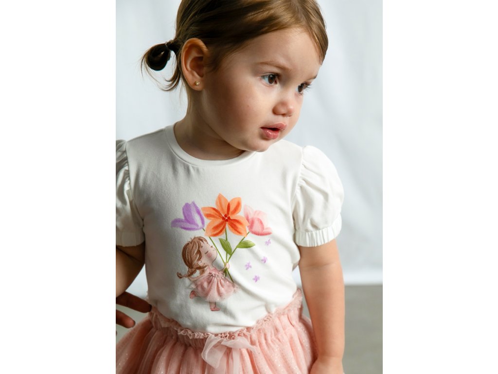 Roztomilé dívčí tričko Mayoral, které okouzlí na první pohled. Jemný potisk holčičky s květinami dodává tričku hravý a něžný vzhled. Díky vysokému podílu bavlny je tričko příjemné na dotek, prodyšné a pohodlné pro celodenní nošení. Příměs elastanu zajišťuje pružnost a lepší přizpůsobení postavě.