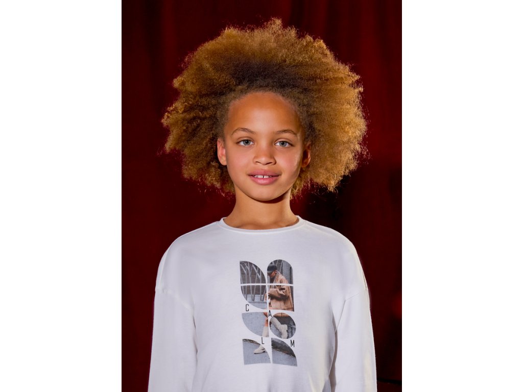 Stylové dívčí tričko Mayoral s dlouhým rukávem v jemném krémovém odstínu potěší každou malou parádnici. Přední stranu zdobí moderní potisk s nápisem CALM a fotografickým motivem, který dodává outfitu šmrnc a městský styl. Tričko je vyrobeno ze 100% bavlny, takže je měkké, prodyšné a příjemné na dotek – ideální pro každodenní nošení do školy i volný čas.