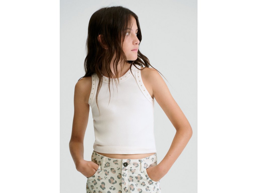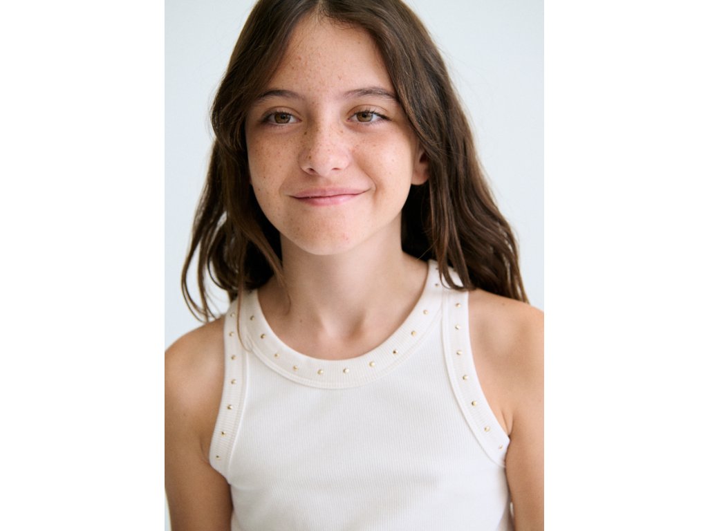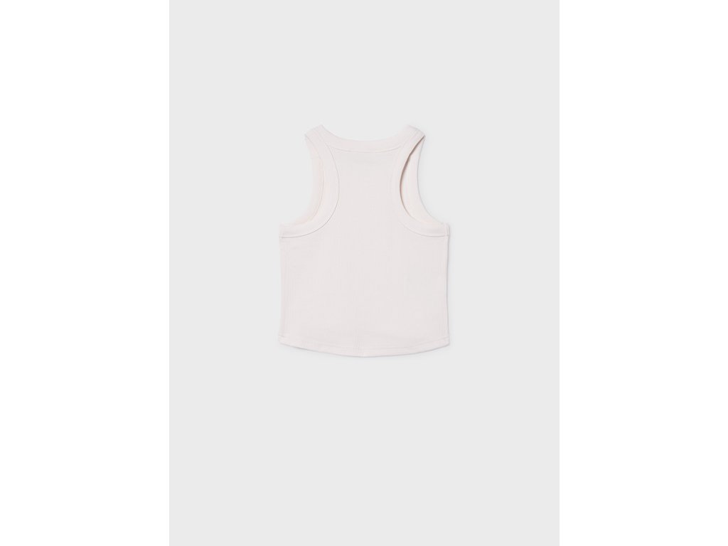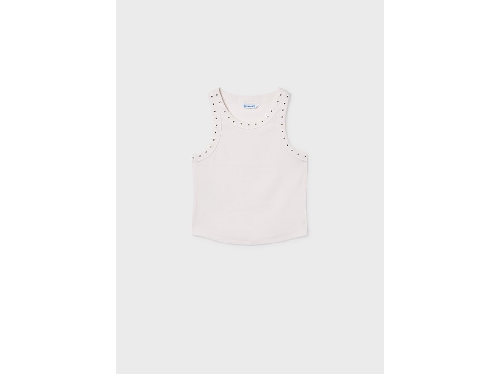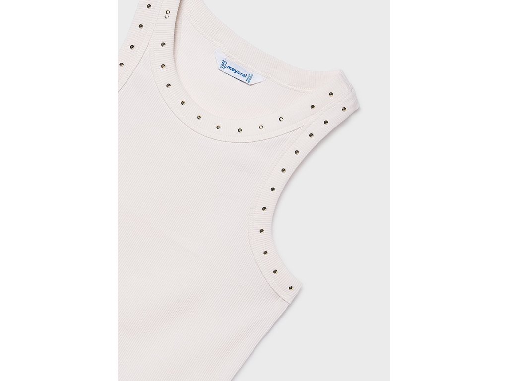 Elegantní dívčí tílko Mayoral v jemném krémovém odstínu je ideální volbou na teplé dny. Moderní žebrovaný materiál krásně sedí na postavě a drobné dekorativní kamínky kolem výstřihu dodávají tílku jemný, dívčí vzhled.
