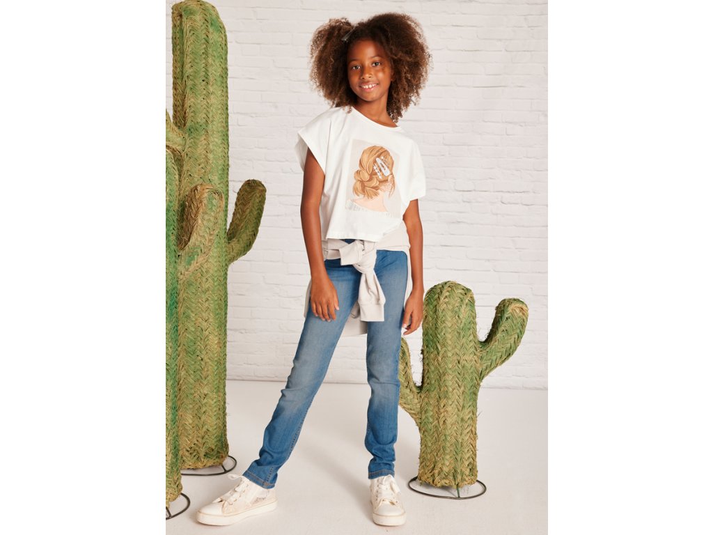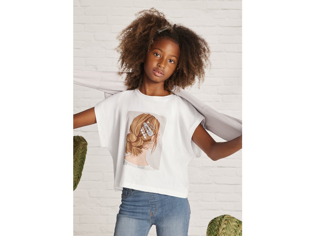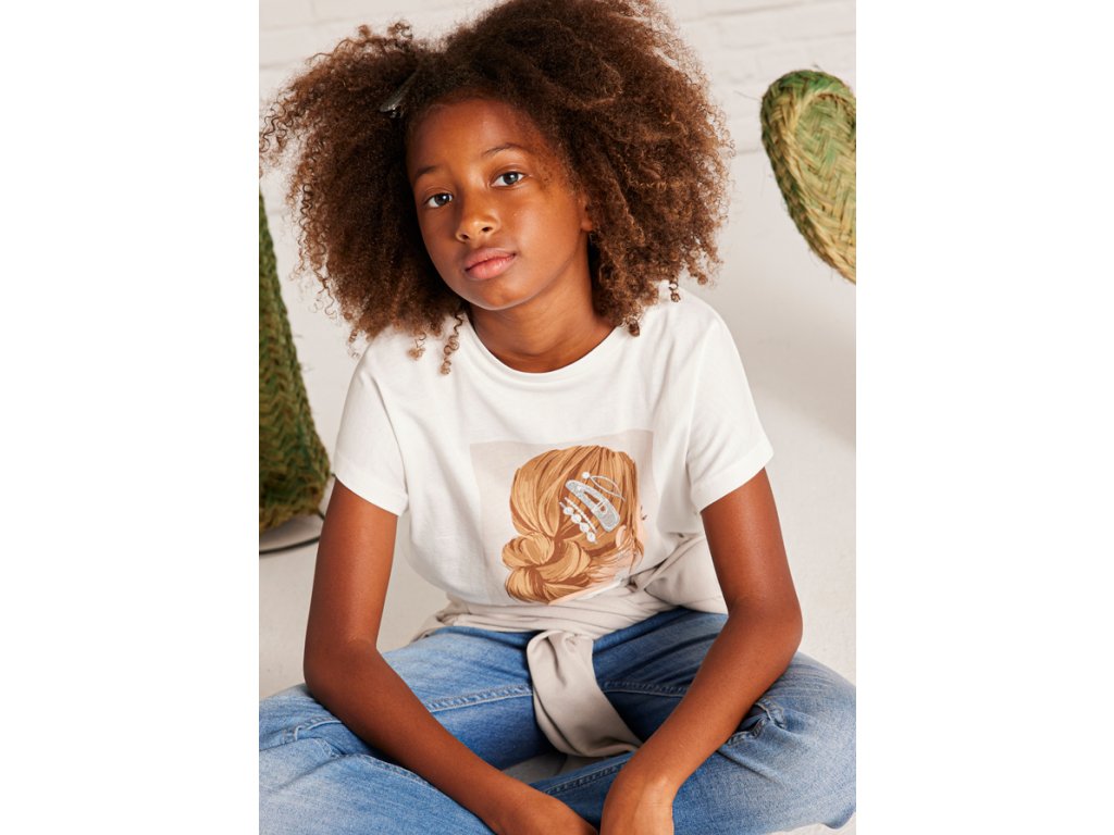 🌟 Stylové dívčí tričko Mayoral s krátkým rukávem, vyrobené ze 100% bavlny, které zajišťuje maximální pohodlí a prodyšnost. Tričko je ozdobeno krásným potiskem dívčího účesu s perlovými sponkami, které dodávají outfitu elegantní a moderní vzhled.