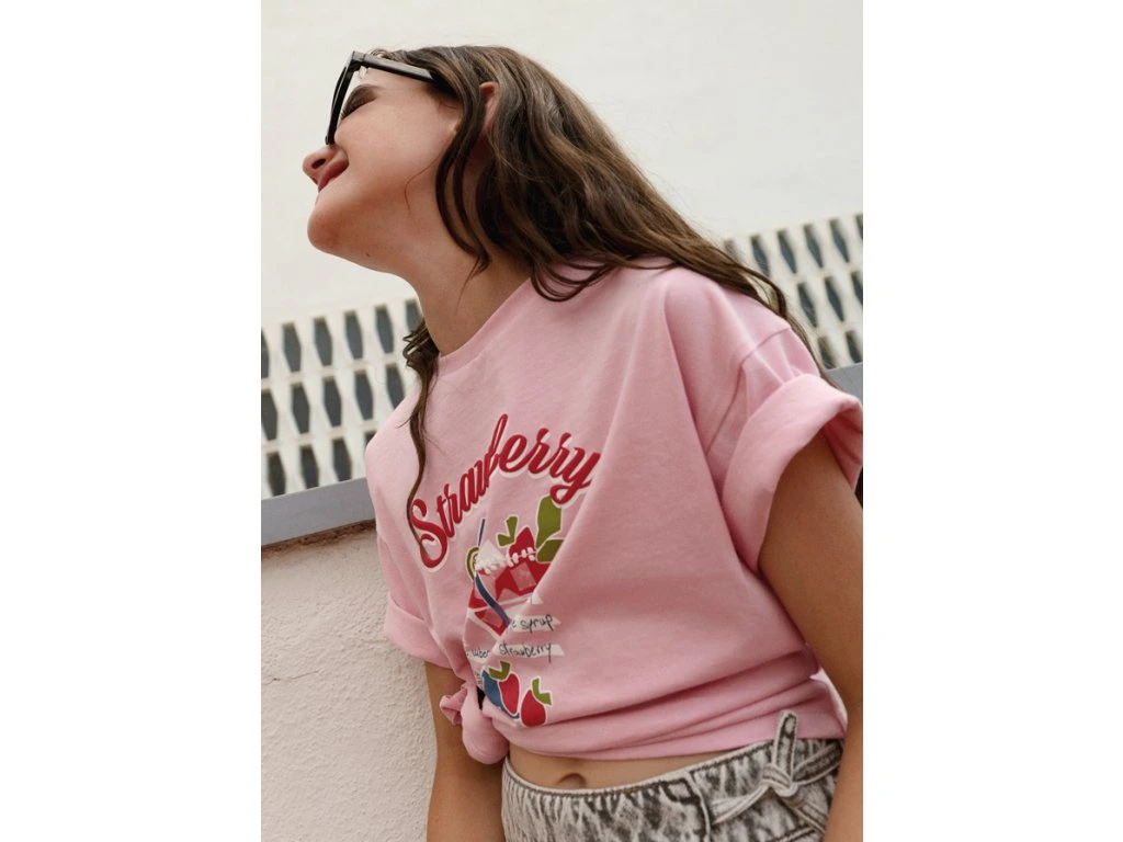 Roztomilé dívčí tričko Mayoral v jemné růžové barvě si zamiluje každá malá parádnice. Hravý potisk s motivem jahodového drinku a nápisem „Strawberry“ dodává tričku svěží letní nádech a styl, který zaujme na první pohled.