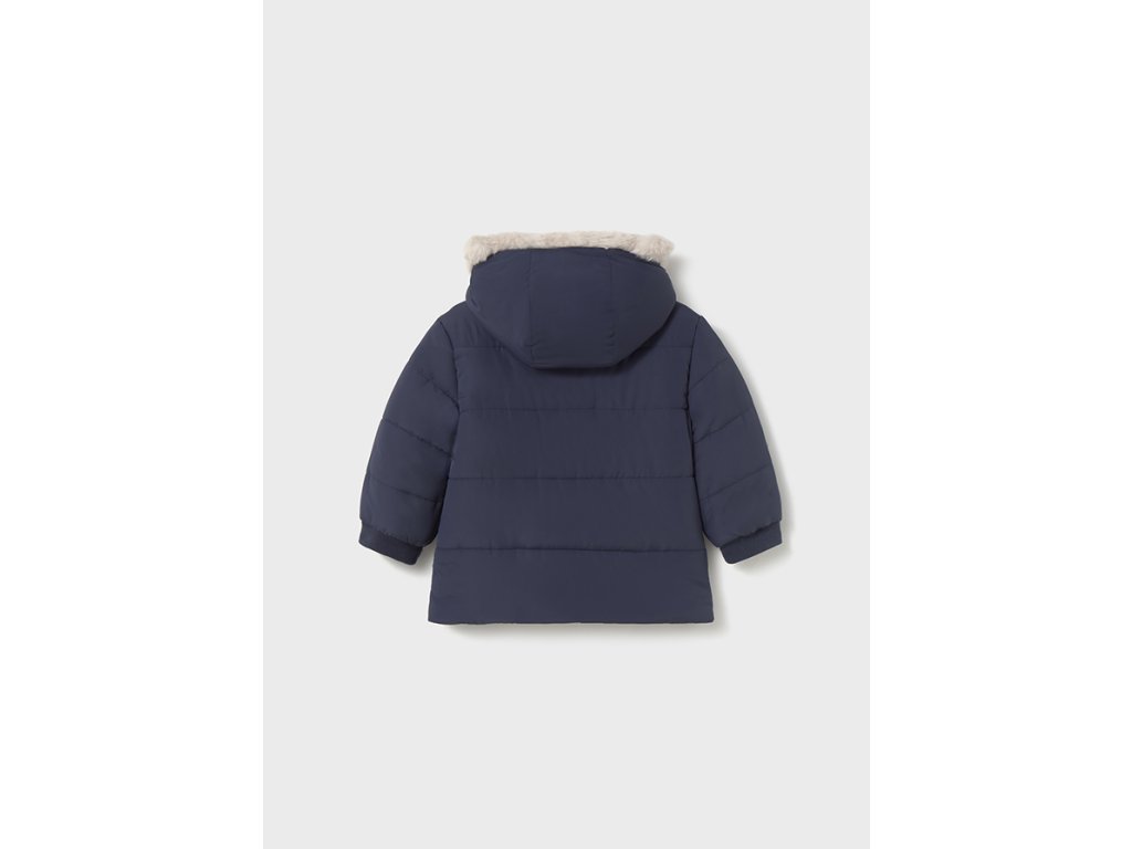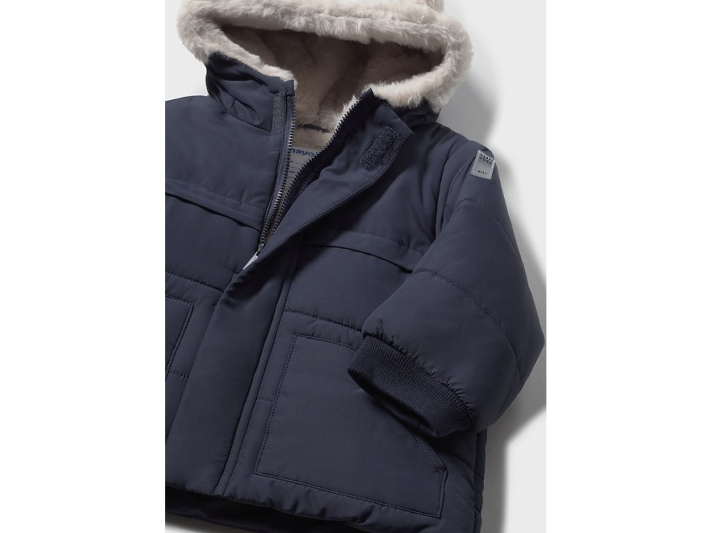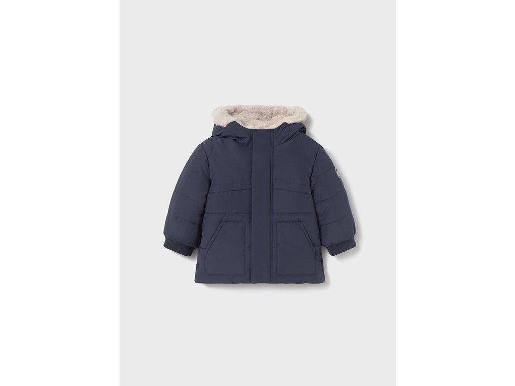 Stylový a hřejivý zimní kabát pro miminka od značky Mayoral v tmavě modré barvě s měkkou kožešinovou podšívkou. Kabát je navržen tak, aby dětem poskytl maximální pohodlí a ochranu i v chladném počasí. Praktická kapuce, zapínání na zip s překryvem na suchý zip a dvě velké přední kapsy dodávají bundě funkčnost i moderní vzhled. Ideální na každodenní nošení i zimní procházky.