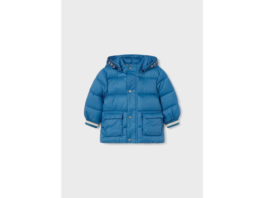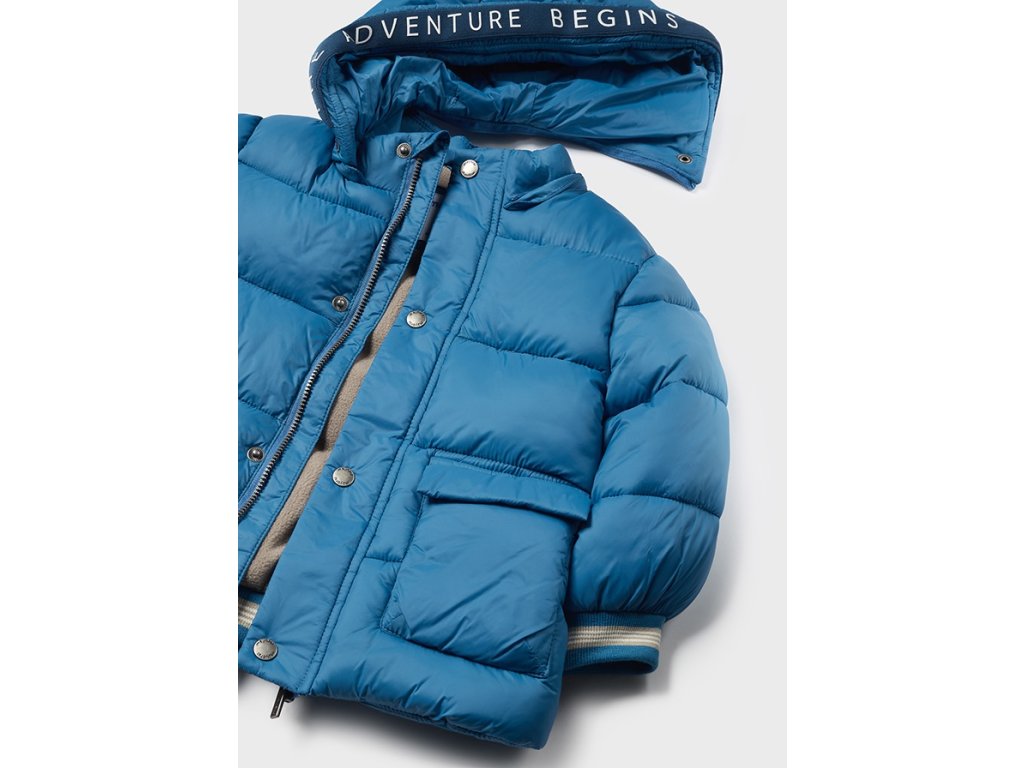 Modrá příjemná zimní bunda s odepínací kapucí Mayoral, se zapínáním na druky a zip, s měkkou a hřejivou podšívkou. V této bundě nebude vašemu synovi zima.